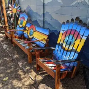 Made with Douglas fir bases, these chairs are all hand painted with oil paints and will last for years! Very sturdy and high quality. They measure 36″ tall by 36″ deep and 64″ wide with the binding cup holders.