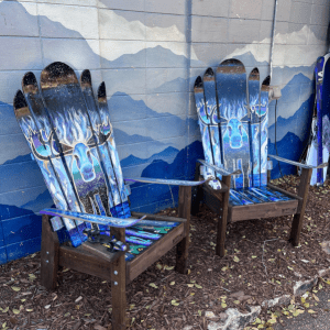Enjoy this set of beautiful Colorado furniture containing two of our popular ski chairs with Ski Bench! These colorful seats will transform your average indoor OR outdoor space into a stylish Colorado display. Bring a piece of unique outdoor vibe home with this hand painted furniture set.