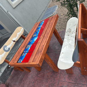 Patio Dining Table + Mural Snowboard Runner + Painted SB Benches – Set of 3
