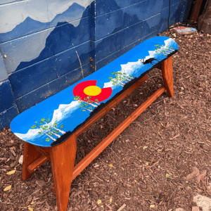 They’re the perfect size to complement your hallway, entryway, front porch living room, with ample room to set down your phone, drinks, books, and dinner plates. Sturdy enough to sit on, they make an ideal boot bench for your hallway! Light enough to bring on any outdoor adventure. Crafted from a single snowboard with ample room to set down your phone, drinks, books, and dinner plates. They have a 300lb. weight capacity so are sturdy enough to sit on – making them an ideal boot bench for your hallway! You can also bring one outdoors and use it as a side table between your ski chairs.
