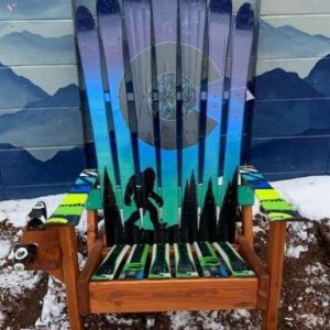 Bigfoot Sasquatch Adirondack Sunset Ski Chair features the legendary Big Foot, painted in a reverse silhouette. Who knows where the Yeti hides…but you may have a sighting while sitting in this chair. Believe…