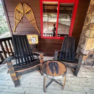 Set of (3) – Two Whiskey Barrel Adirondack Chairs w/ matching side table sits just as comfortably and is equally stylish and durable. Our beautiful Adirondack Barrel Chairs are truly amazing and one of our most popular items.