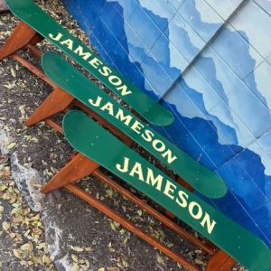 Get (1) 3-person replica Skilift Bench (any color), (1) Vintage Set of Snowshoes (1) Ski Headboard (Queen included), (1) Ski Coffee Table & (1) Wall mounted SB Coat Hook – hand painted