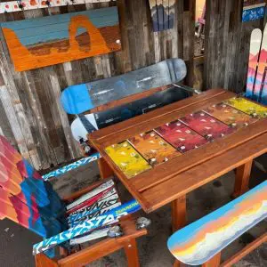 Set of (5) – (1)LARGE PATIO DINING TABLE W/ SNOWBOARD RUNNER & (2) Snowboard Dining Chairs & (2) Restaurant Booth Style Ski Benches