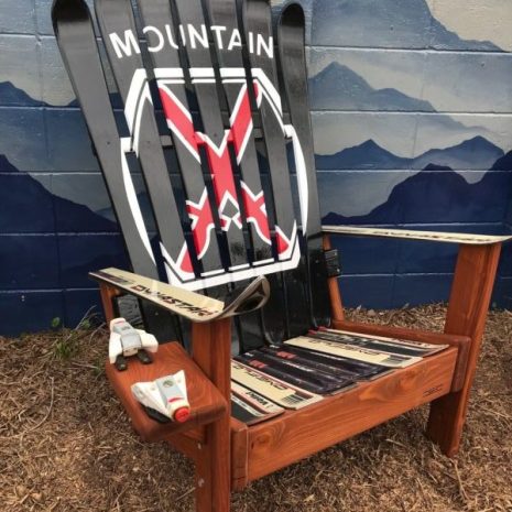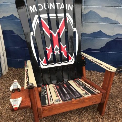 - Constructed in Colorado from retired skis on a sturdy Douglas Fir base. All chairs include a custom ski binding cup holder. Big enough for a stein.