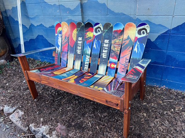 Alpine Low back Powder Ski Bench Beautiful, comfortable and eye catching. A perfect way to relax, kick back and relax your troubles away. The bench has such a peaceful, easy feeling about it as you sit back and let your trouble melt away and let your smile grow. We can paint them tons of different ways so make sure to look at the photo gallery or send us your ideas straight away and we can custom make you whatever you want as well!