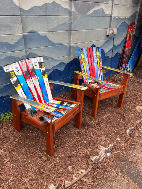 Our Alpine Ski Chairs are constructed from retired skis on a Douglas Fir base, and all of our furniture is incredibly durable and made to last the wear and tear of indoor or outdoor elements.
