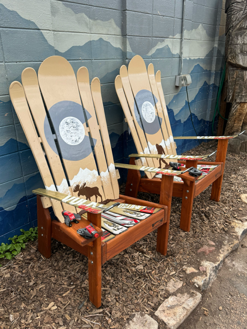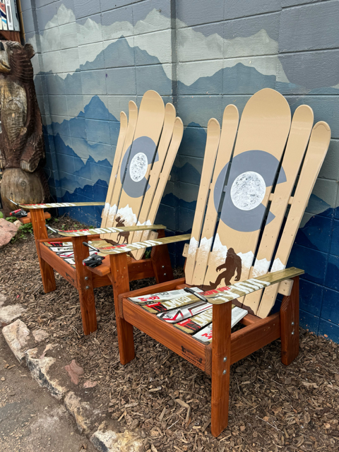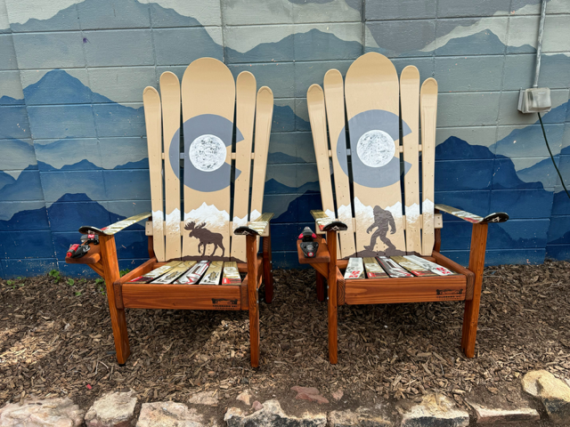 - Constructed in Colorado from retired skis on a sturdy Douglas Fir base. All chairs include a custom ski binding cup holder. Big enough for a stein.