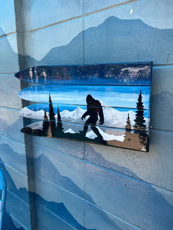 Bluesky Bigfoot Mountain Mural Ski Wall Art hand painted on Skis hand painted with oil on recycled skis. Medium sized makes a perfect addition to any room in your home, cabin, condo or as a gift! Roughly 24″ WIDE and 13″ TALL, varies per piece as no skis are the exact same size.