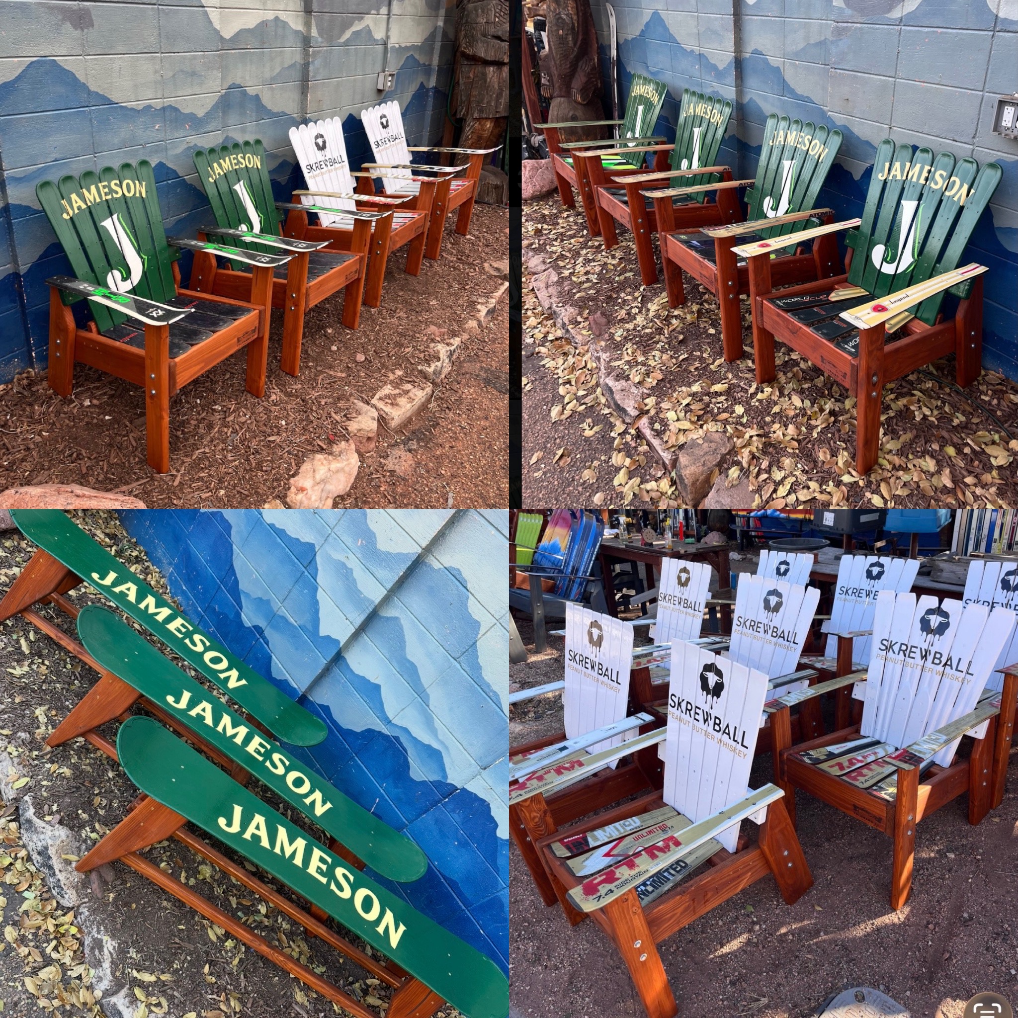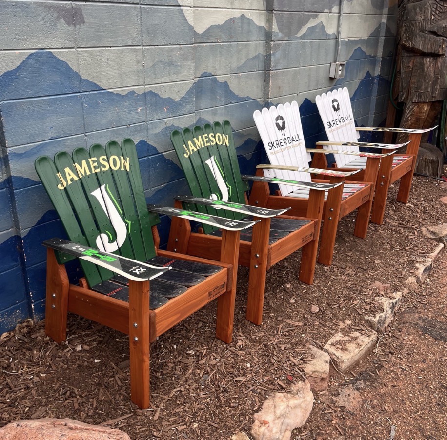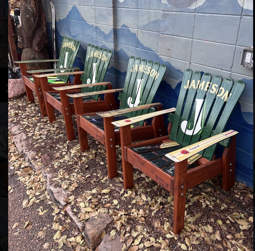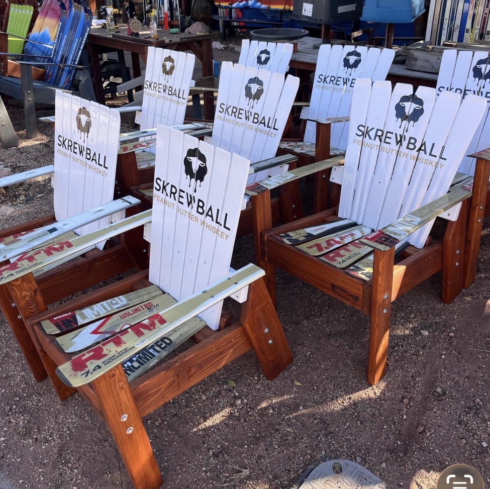 Our Alpine Ski Chairs are constructed from retired skis on a Douglas Fir base, and all of our furniture is incredibly durable and made to last the wear and tear of indoor or outdoor elements.