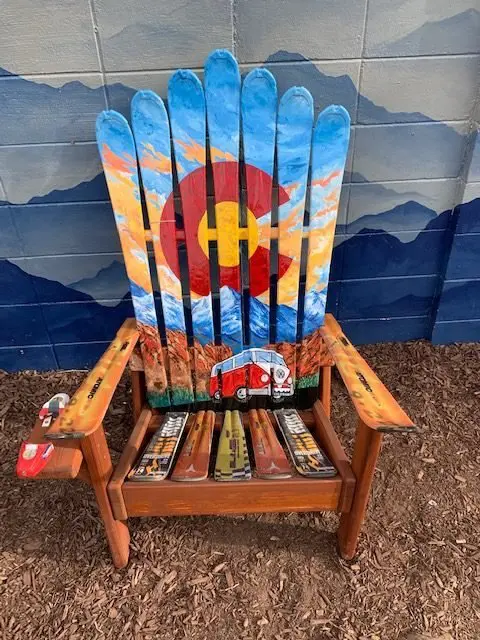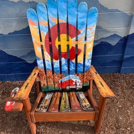 - Constructed in Colorado from retired skis on a sturdy Douglas Fir base. All chairs include a custom ski binding cup holder. Big enough for a stein.