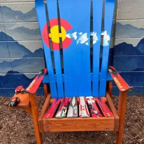CO Flag Mountain Stripe Hybrid Aki/Snowboard Chair, a perfect chair for your porch or deck or fire pit, or a perfect gift for any occasion! Make your space more beautiful, memorable and unique. We can create whatever YOU want for your unique space! Buy local, shop small and take advantage of these beautiful creations to impress your friends, family, clients or loved one with an impressive, memorable Colorado made creation!