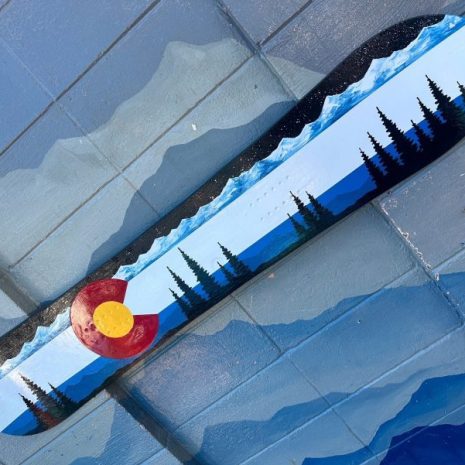 Colorado Flag – Mt. Mural (pick your favorite sky color), hand painted on an original snowboard (60″x10″)