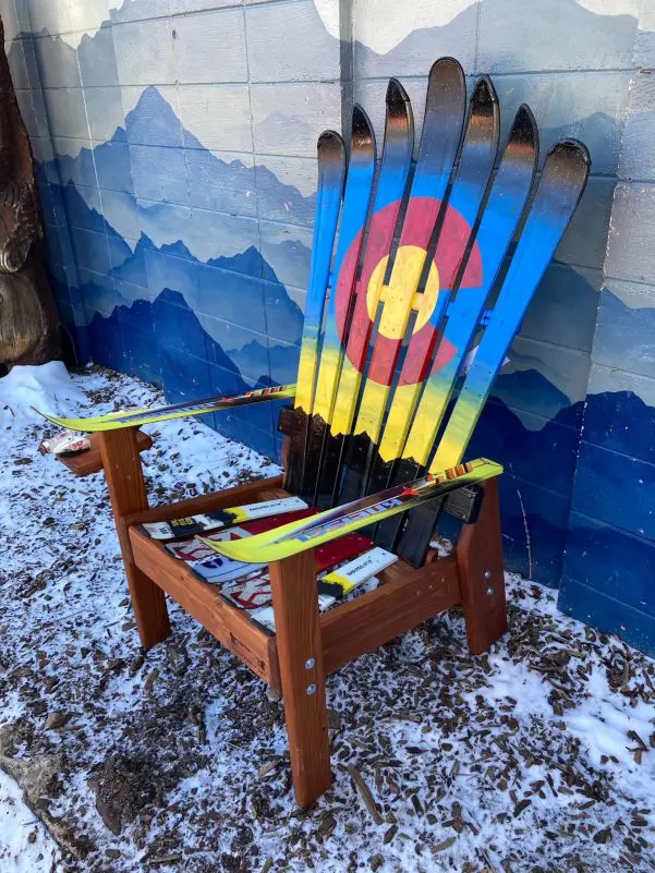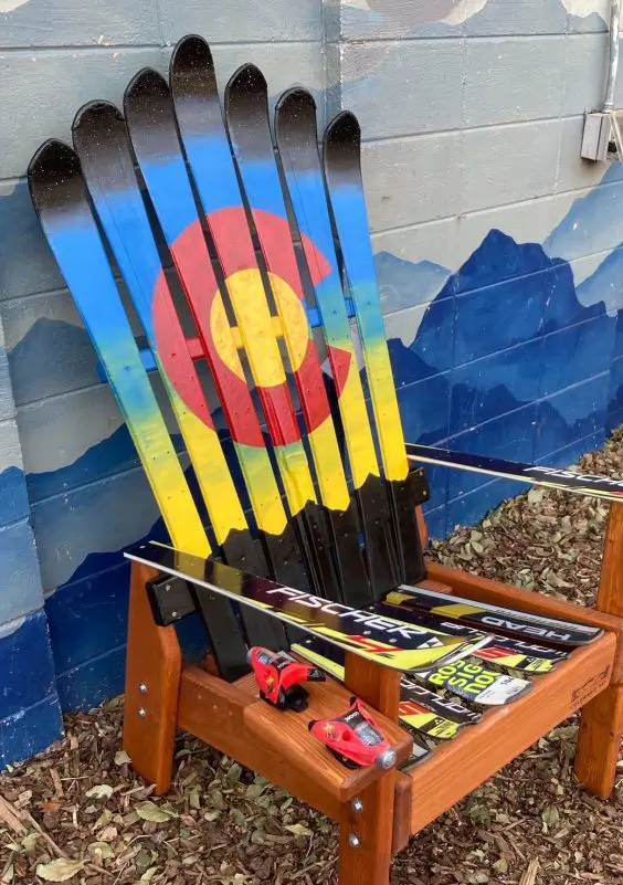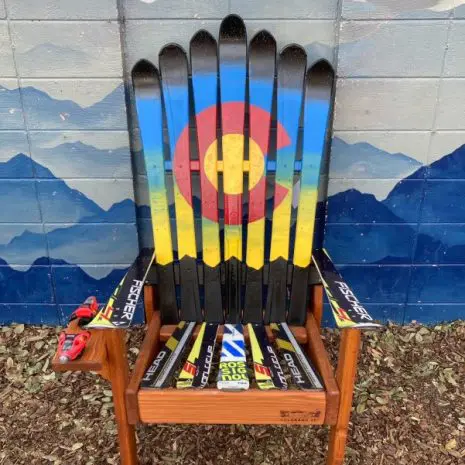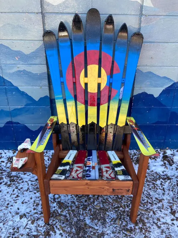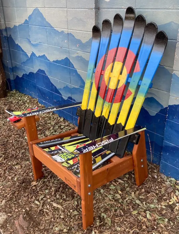 - Constructed in Colorado from retired skis on a sturdy Douglas Fir base. All chairs include a custom ski binding cup holder. Big enough for a stein.