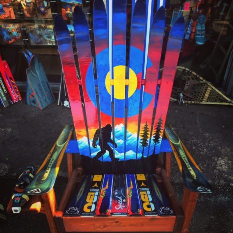 - Constructed in Colorado from retired skis on a sturdy Douglas Fir base. All chairs include a custom ski binding cup holder. Big enough for a stein.