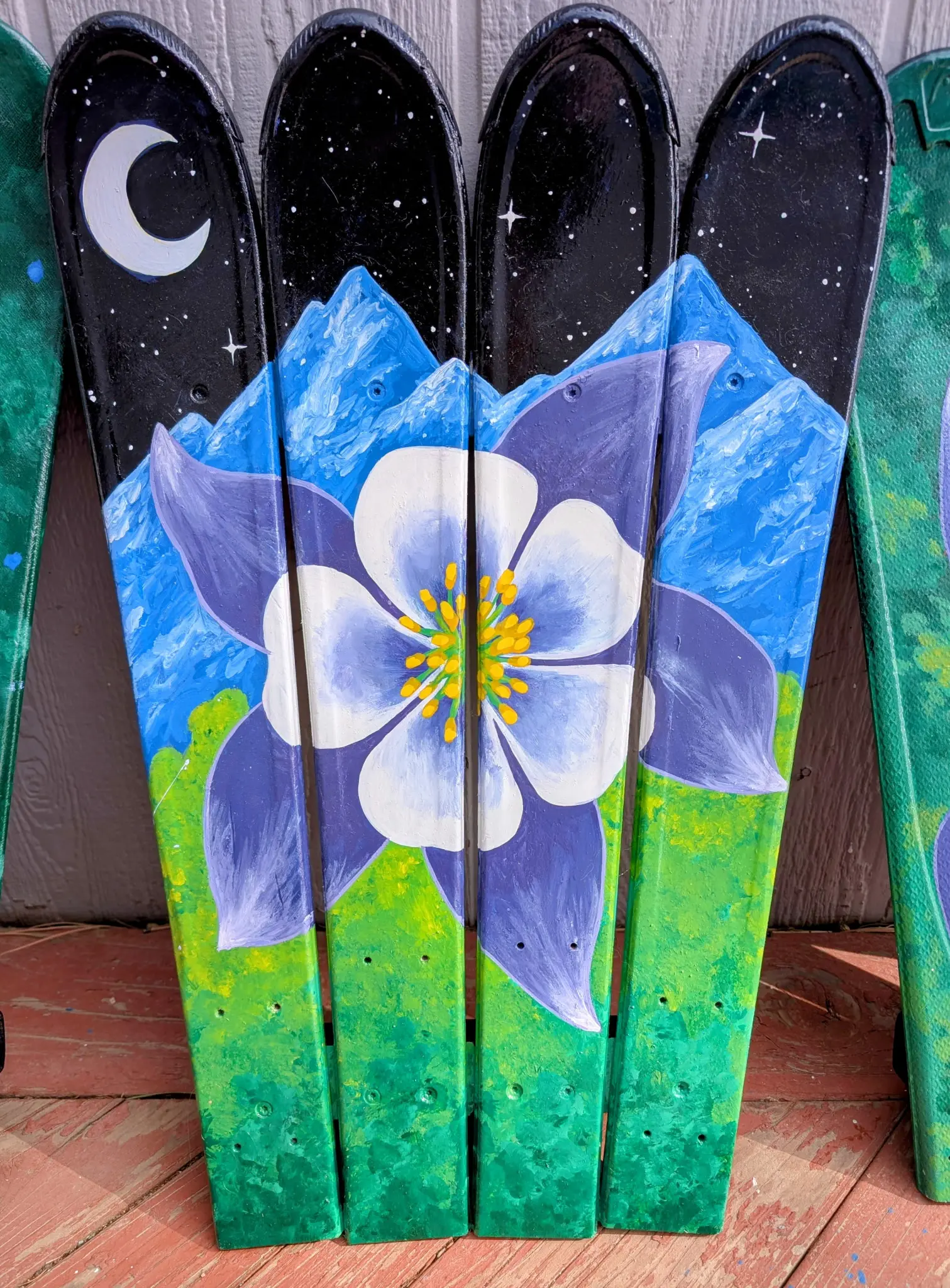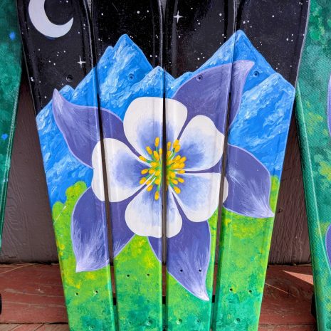 Columbine hand painted ski wall art hand painted on recycled downhill skis, these one of a kind wall flags will impress in any room of the house, or make the perfect gift for a colleague, friend, or loved one! We can also do them on snowboards, hockey sticks, cross country skis, wake boards, water skis or various types of wood including cedar, pine, pallets, barn wood and more!