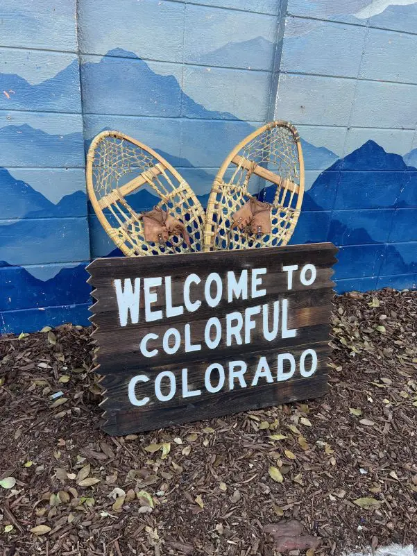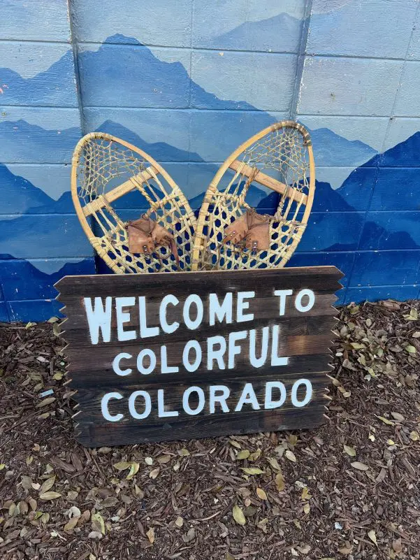 Combo: 36″ Welcome to CO” Barnwood Sign + Stand + Snowshoes