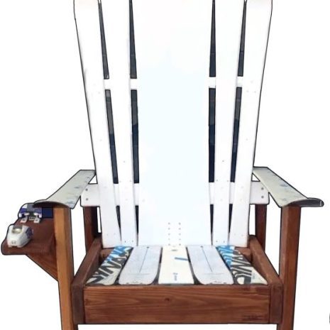 - Constructed in Colorado from retired skis on a sturdy Douglas Fir base. All chairs include a custom ski binding cup holder. Big enough for a stein.