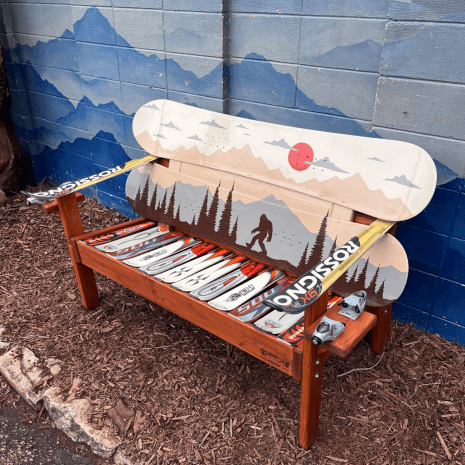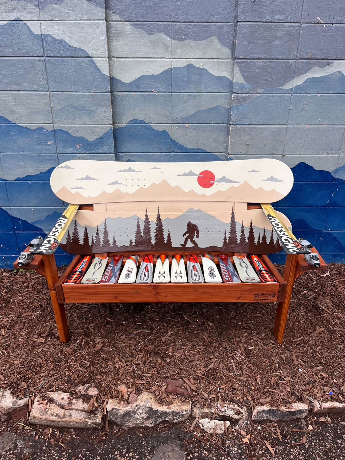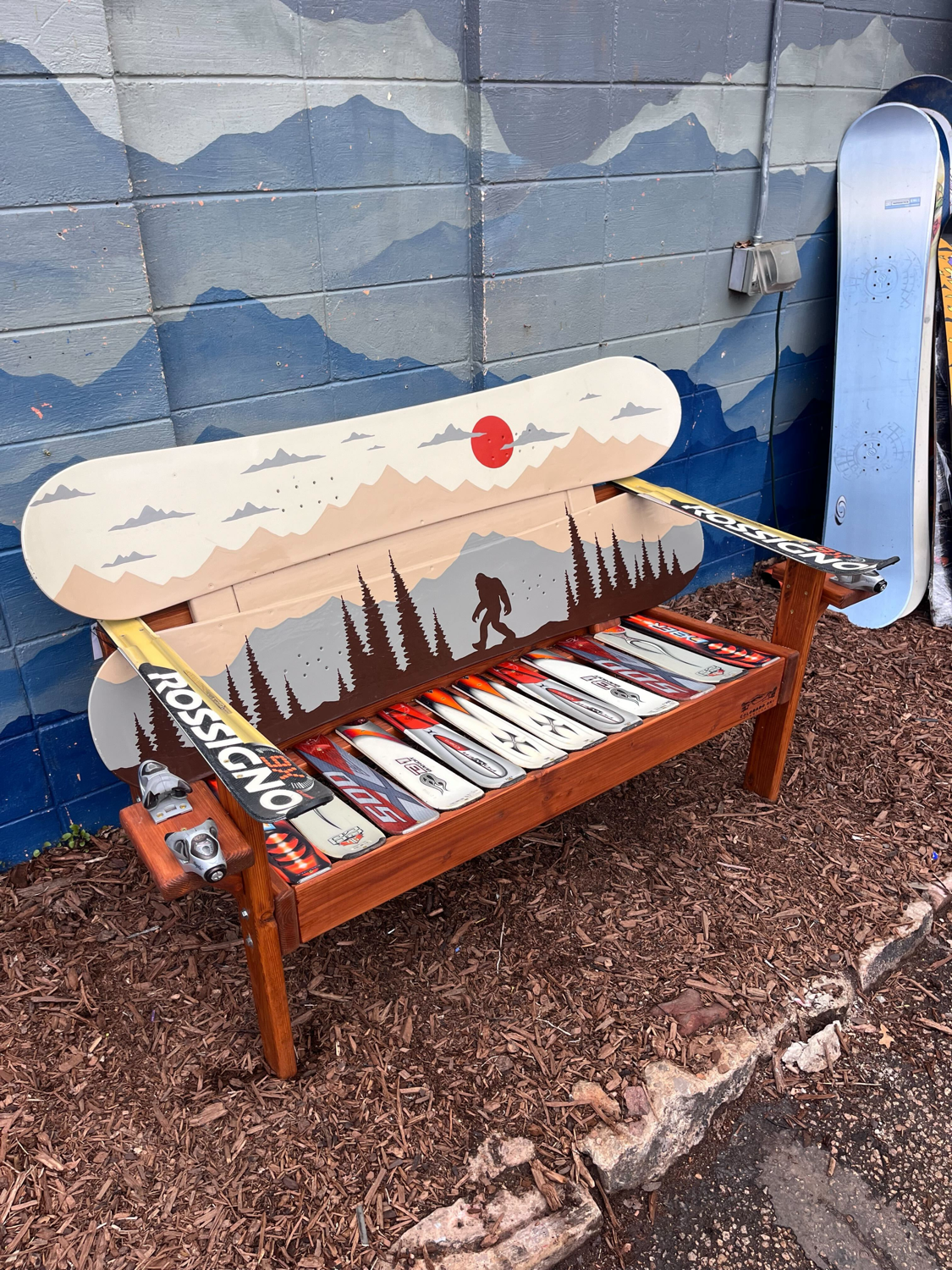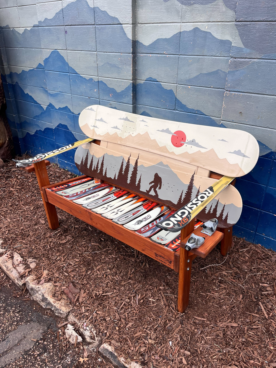 This stylish Earth tones. The Bigfoot/Sasquatch Mountain Stroll Snowboard Bench is made from repurposed snowboards and skis, ideal for any lover of the slopes. Transform your space into a sporty, yet stylish display. Reminisce good memories with family and friends on this unique piece of Colorado gear! Built with quality in mind, this bench offers both comfort and durability.