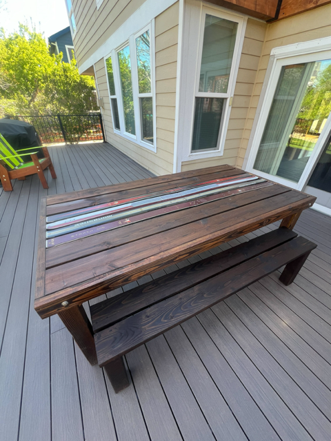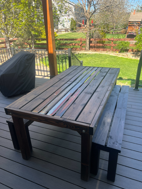 Farmhouse Table & Benches Patio Set w/ retro ski runner. Dark Walnut stain pictured.