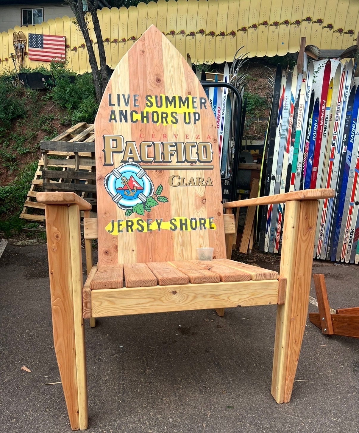 Our XXL oversized Adirondack chair. Measures 84″ tall x 50″ x 47″. (Includes vinyl logo, We will call- add info in notes)