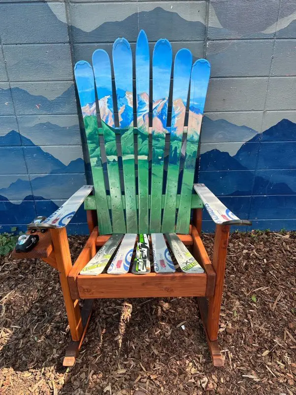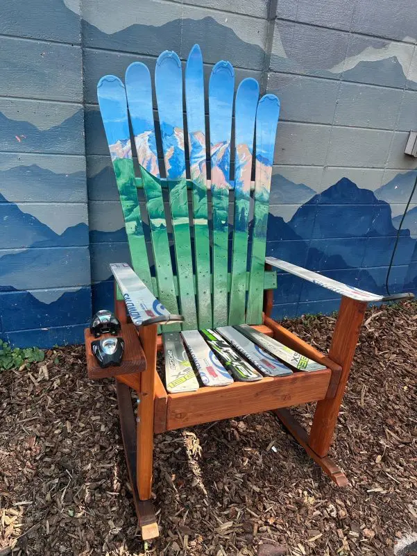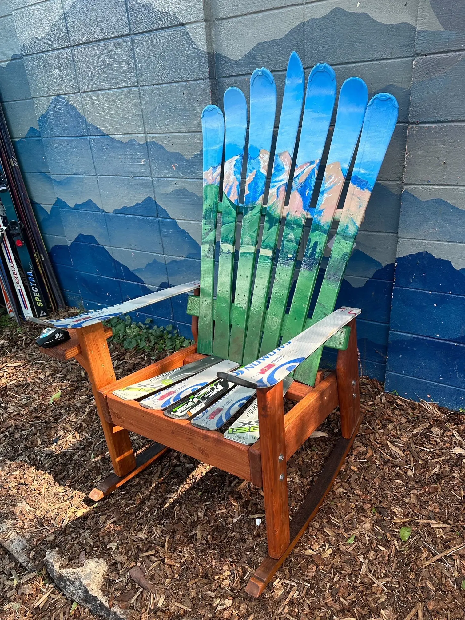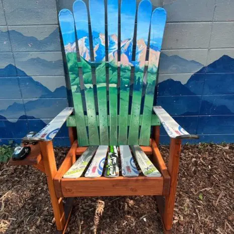 - Constructed in Colorado from retired skis on a sturdy Douglas Fir base. All chairs include a custom ski binding cup holder. Big enough for a stein.