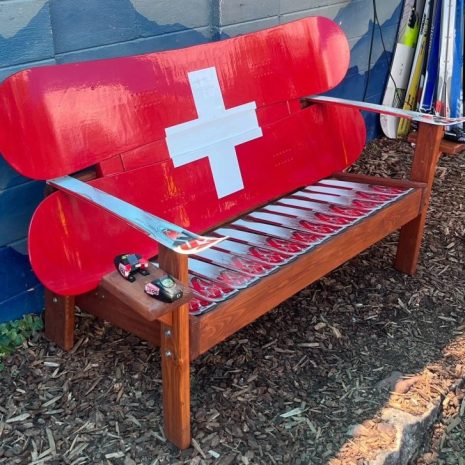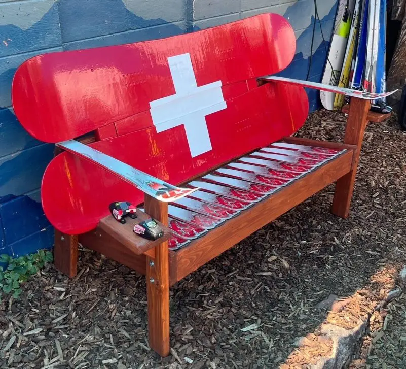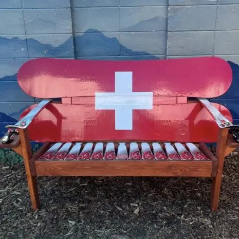 The unique Swiss flag Snowboard Bench offer a sporty outdoor vibe, making them a great addition to any venue. With their stylish appearance and customizability, you will have a truly original piece. Built with quality in mind, these chairs offer both comfort and durability.