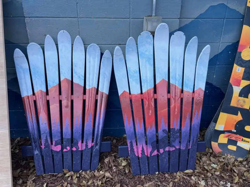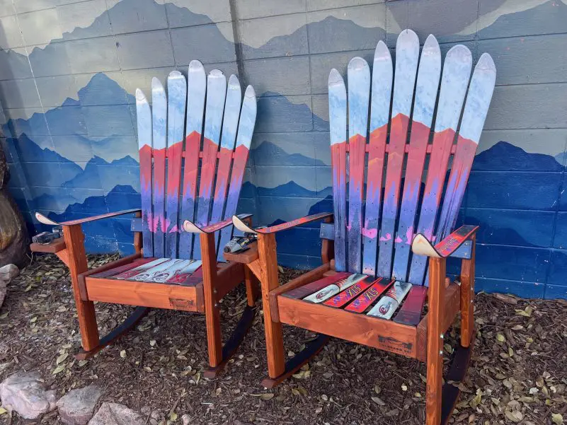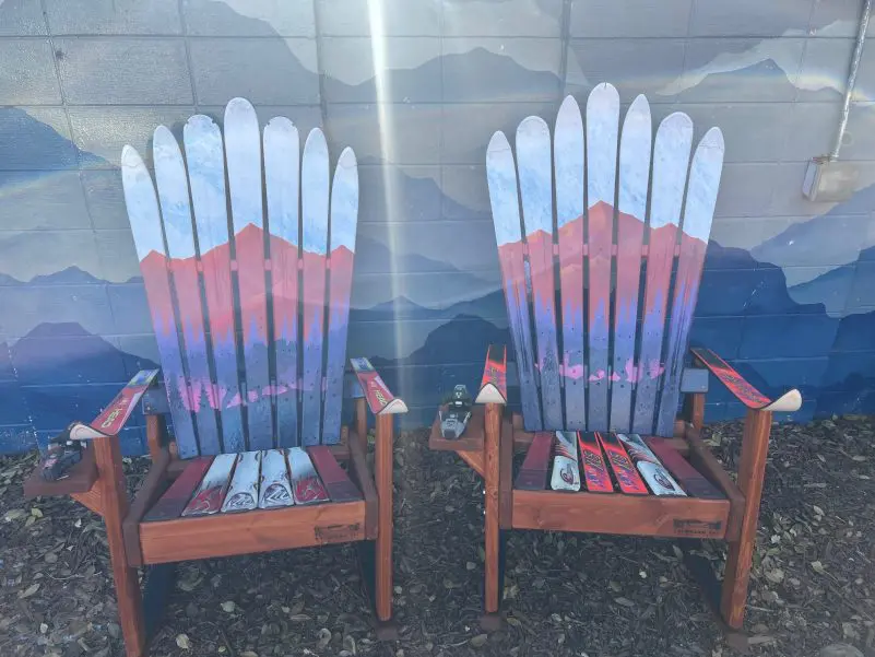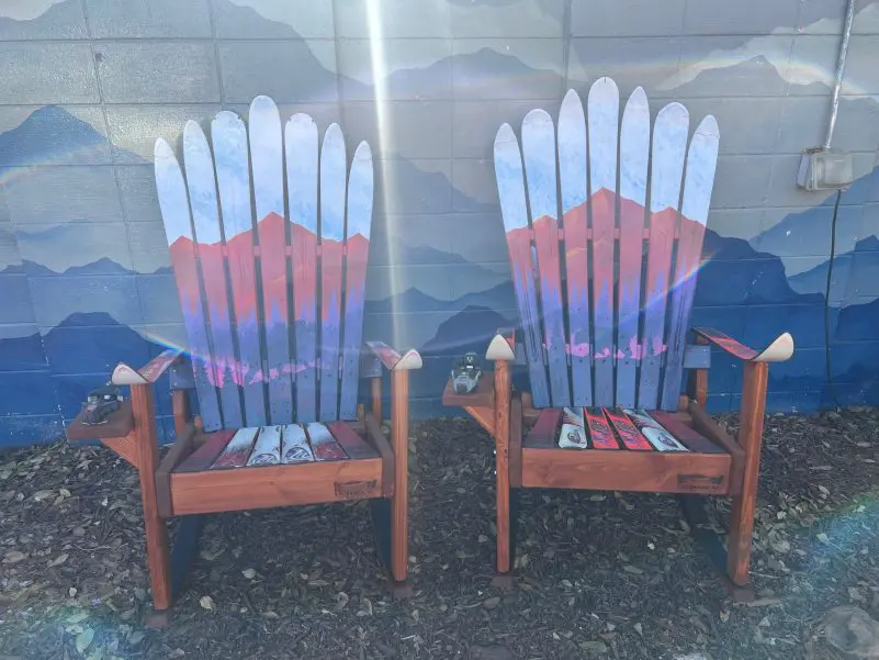 - Constructed in Colorado from retired skis on a sturdy Douglas Fir base. All chairs include a custom ski binding cup holder. Big enough for a stein.
