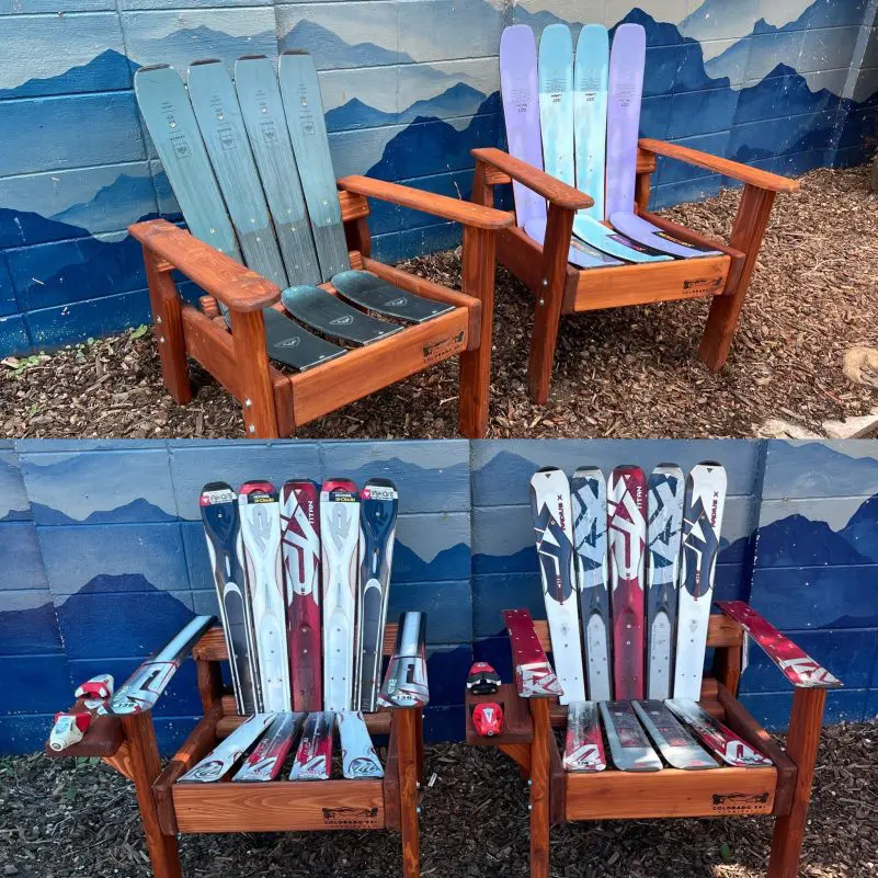 We pick the skis (no returns). Constructed from retired skis on a Douglas Fir base, all of our furniture is incredibly durable and made to last wear and tear of indoor or outdoor elements.