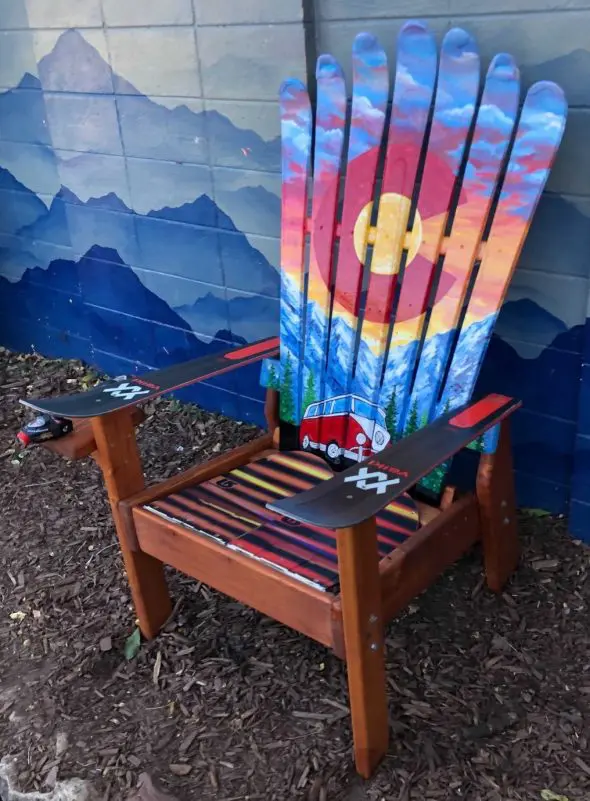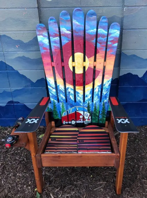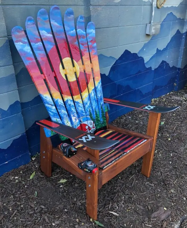 - Constructed in Colorado from retired skis on a sturdy Douglas Fir base. All chairs include a custom ski binding cup holder. Big enough for a stein.