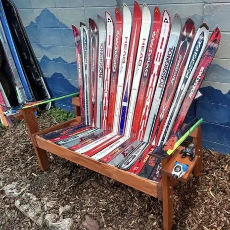 Original ski art, ski bench! Tell us whatever colors you want! Colorado ski & snowbaord Chairs and benches are super popular, durable, fun and built with quality craftsmanship to last! Bring your love of Colorado, the mountains, fire pits, stars, s’mores, marshmallow, camping and snowboarding home on your deck, patio or yard. Get your chill spot dialed in right!