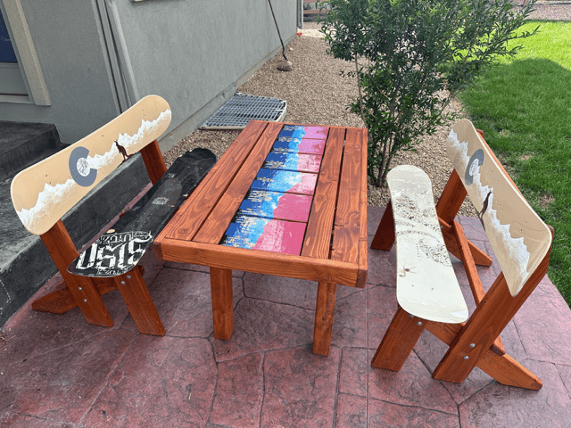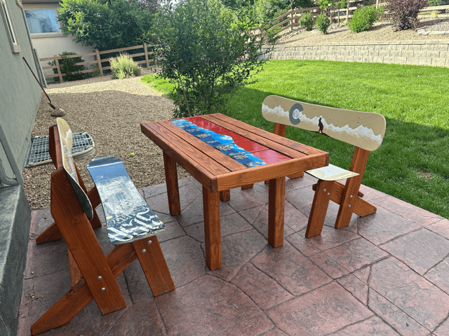 Patio Dining Table + Mural Snowboard Runner + Painted SB Benches – Set of 3
