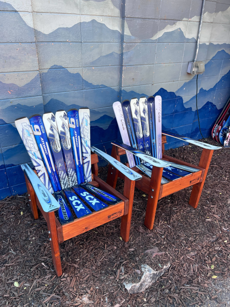 Our Alpine Ski Chairs are constructed from retired skis on a Douglas Fir base, and all of our furniture is incredibly durable and made to last the wear and tear of indoor or outdoor elements.