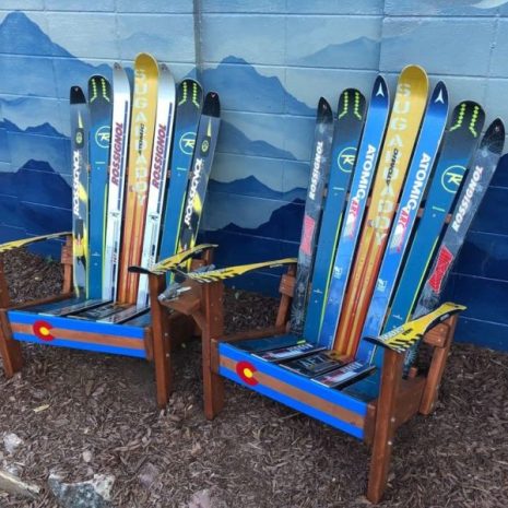 This set of chairs contain our classic Adirondack ski chairs. The front boards on the chairs depict the Colorado state flag in classic fashion. These chairs are made from repurposed skis and designed with comfort in mind. Add some character to your home with these premium chairs!