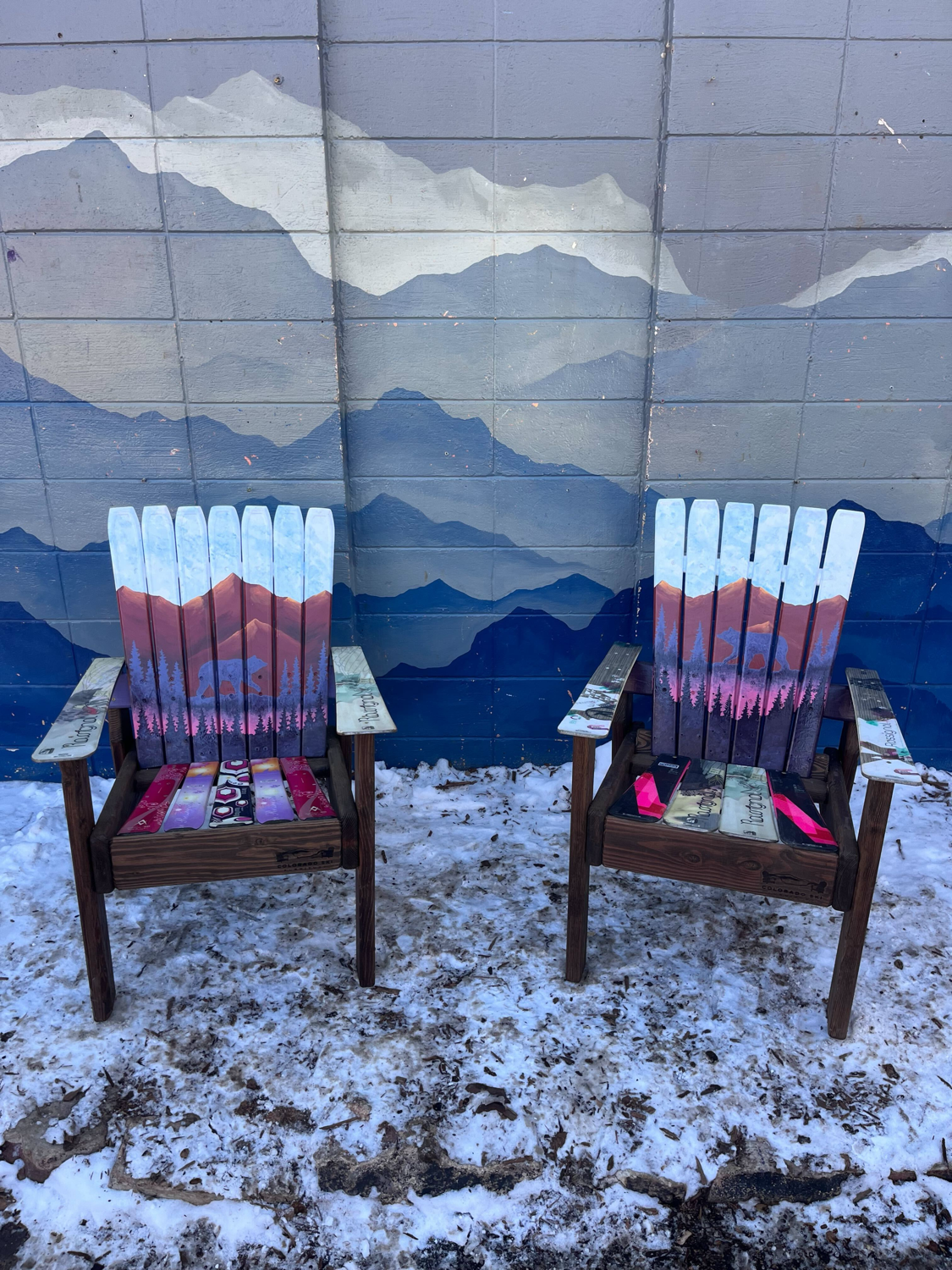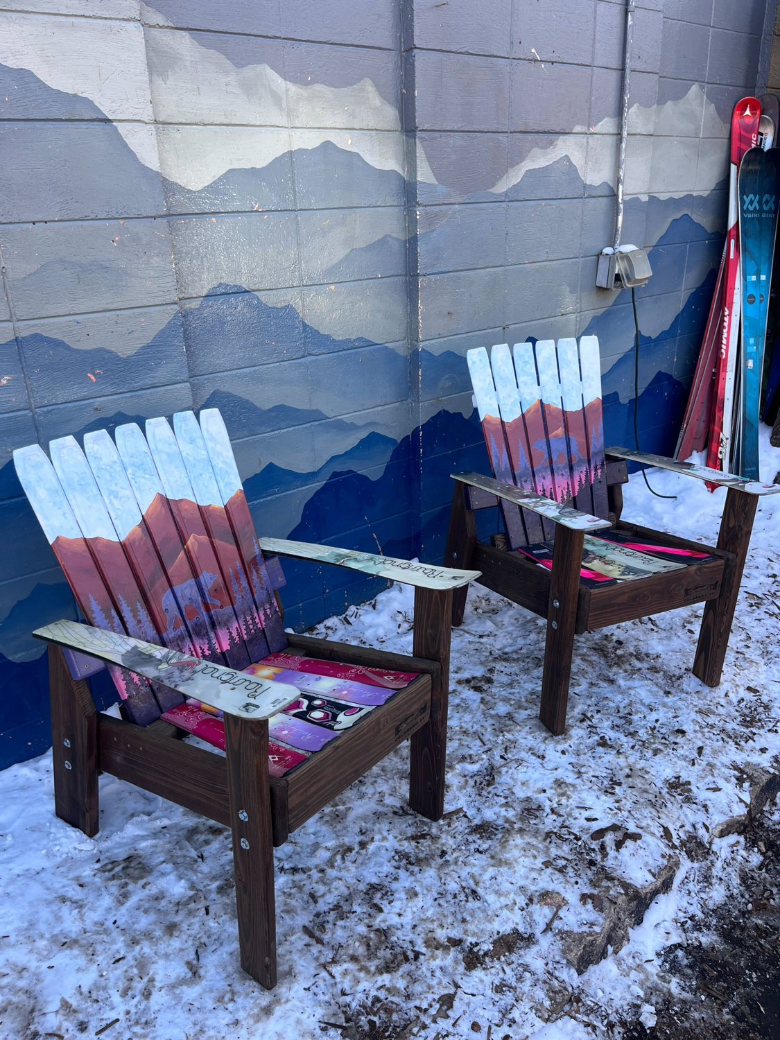 - Constructed in Colorado from retired skis on a sturdy Douglas Fir base. All chairs include a custom ski binding cup holder. Big enough for a stein.