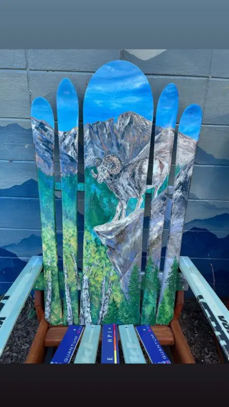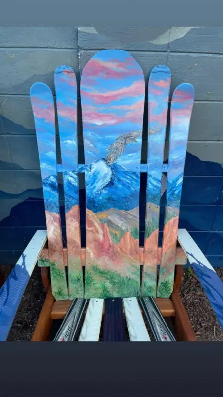 - Constructed in Colorado from retired skis on a sturdy Douglas Fir base. All chairs include a custom ski binding cup holder. Big enough for a stein.