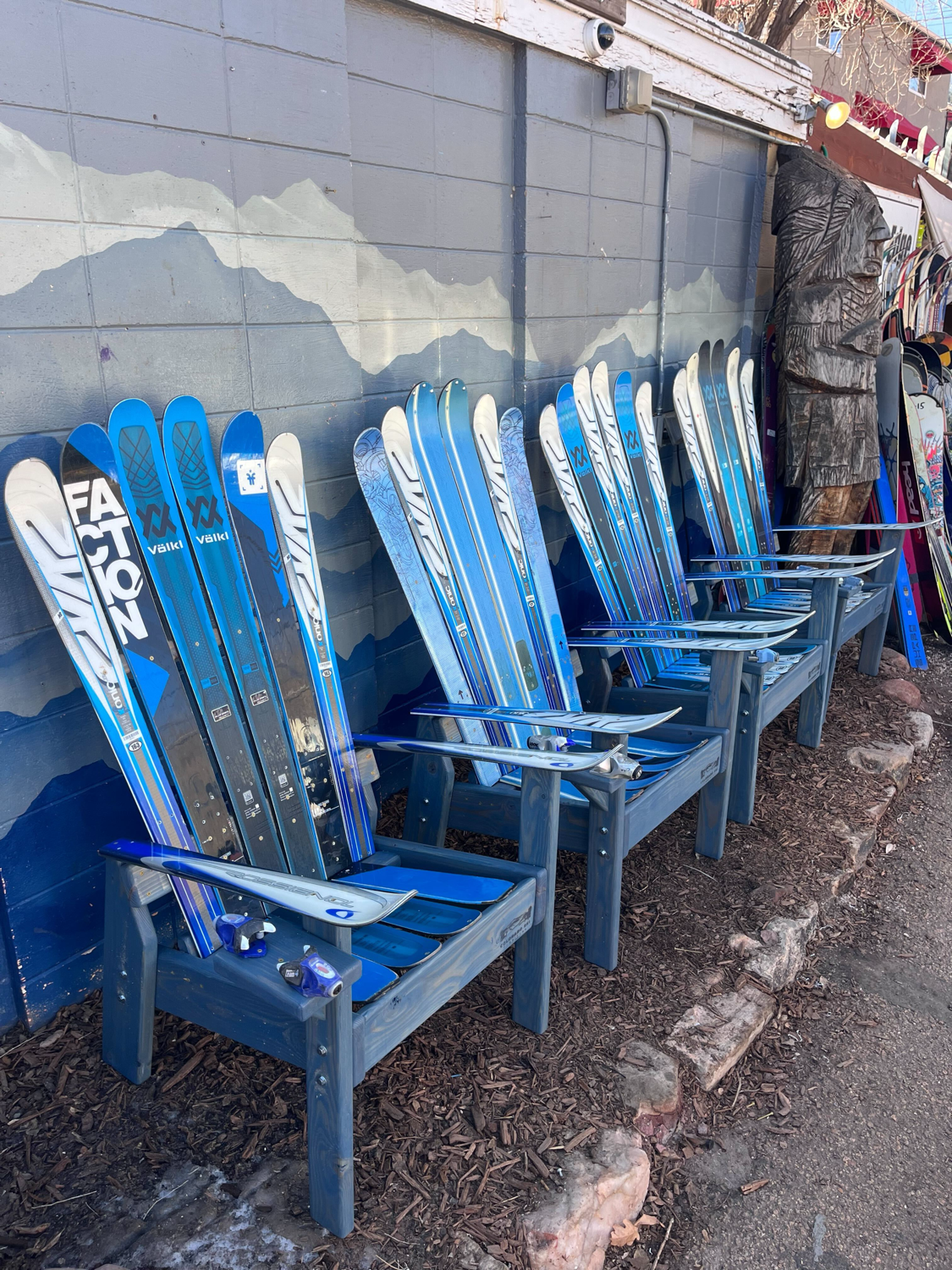 Constructed from retired skis on a Douglas Fir base, all of our furniture is incredibly durable and made to last in the elements. They measure 45″ tall by 36″ deep and 32″ wide with the binding cup holders. We use high quality exterior oil paint so you’ll get a product that will remain colorful, beautiful and weatherproof.