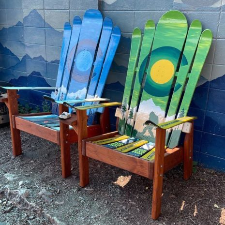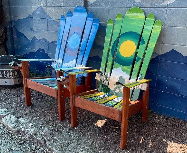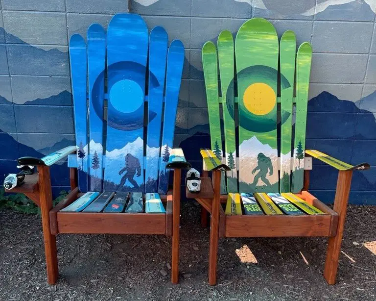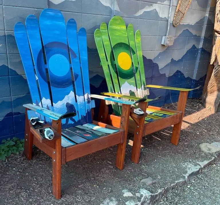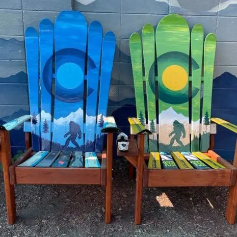 - Constructed in Colorado from retired skis on a sturdy Douglas Fir base. All chairs include a custom ski binding cup holder. Big enough for a stein.