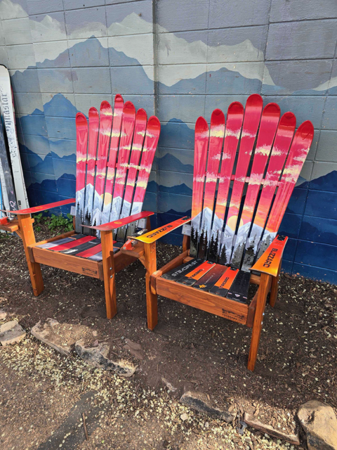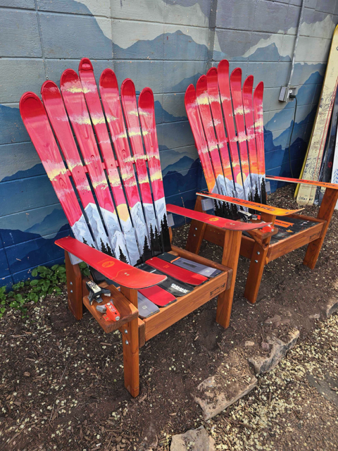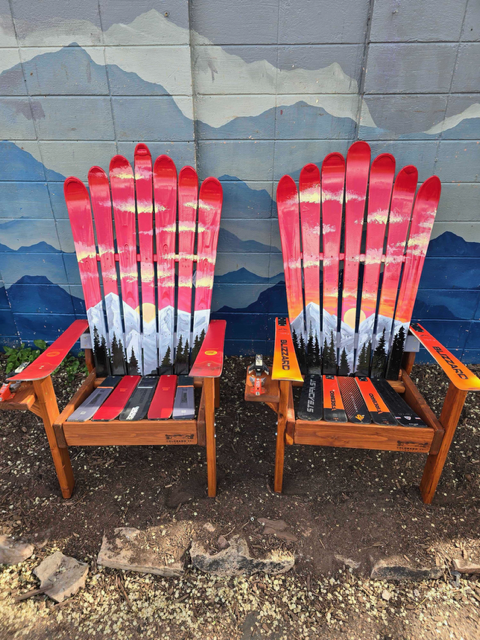 - Constructed in Colorado from retired skis on a sturdy Douglas Fir base. All chairs include a custom ski binding cup holder. Big enough for a stein.