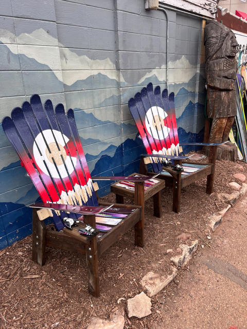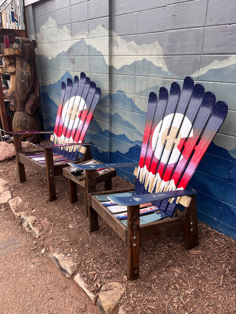 - Constructed in Colorado from retired skis on a sturdy Douglas Fir base. All chairs include a custom ski binding cup holder. Big enough for a stein.