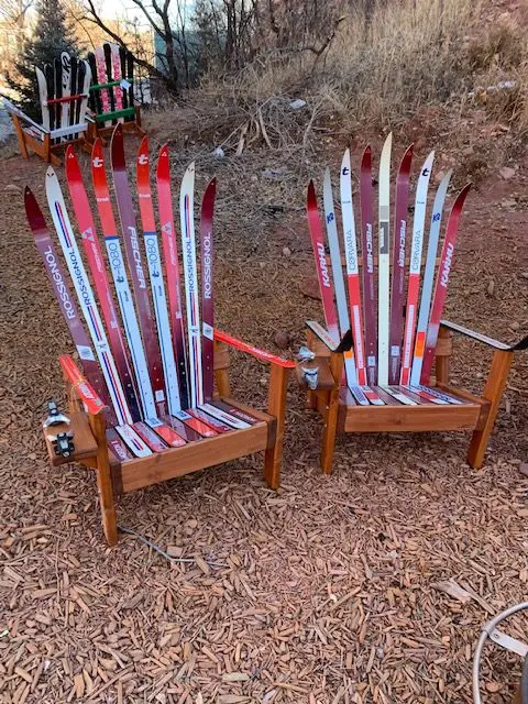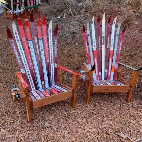 Constructed from retired skis on a Douglas Fir base, all of our furniture is incredibly durable and made to last in the elements. They measure 45″ tall by 36″ deep and 32″ wide with the binding cup holders. We use high quality exterior oil paint so you’ll get a product that will remain colorful, beautiful and weatherproof.