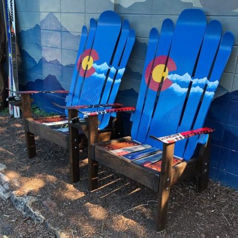 - Constructed in Colorado from retired skis on a sturdy Douglas Fir base. All chairs include a custom ski binding cup holder. Big enough for a stein.
