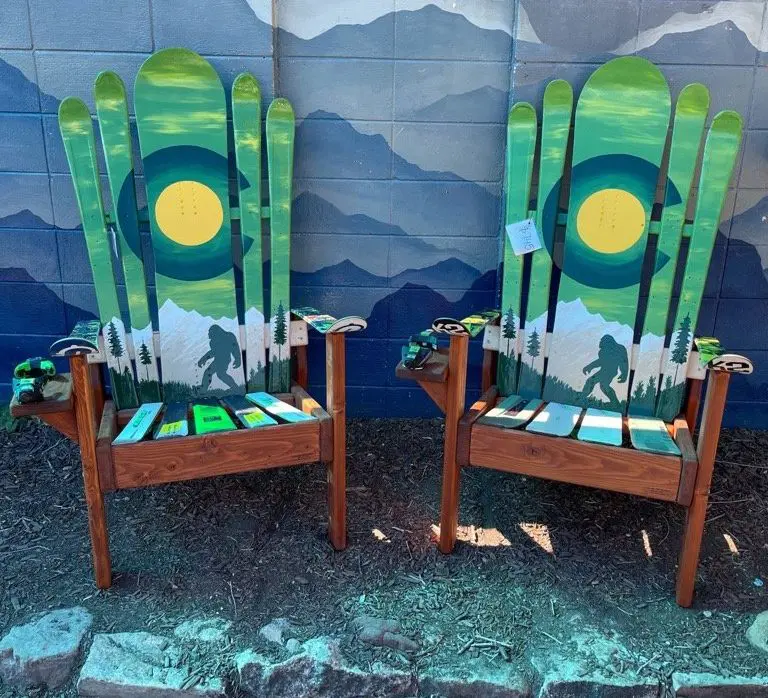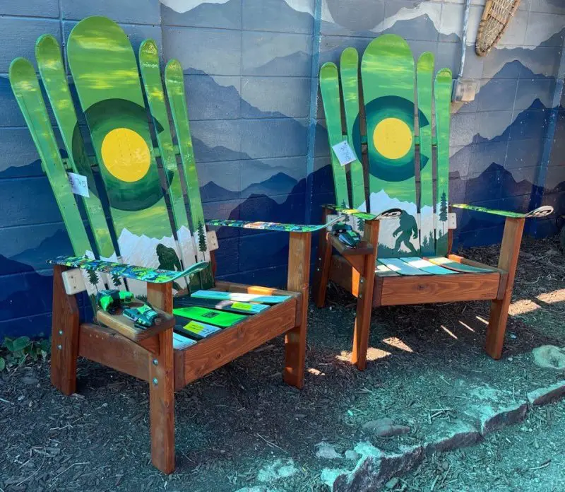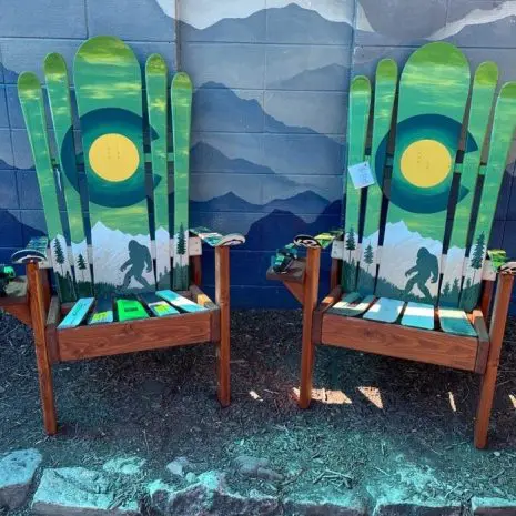 This set of chairs contain our classic adirondack ski chairs. The chairs depict the Colorado state flag and a bigfoot silhouette for a fun, unique twist. These chairs are made from repurposed skis and designed with comfort in mind. Add some personality to your space with these fun chairs!