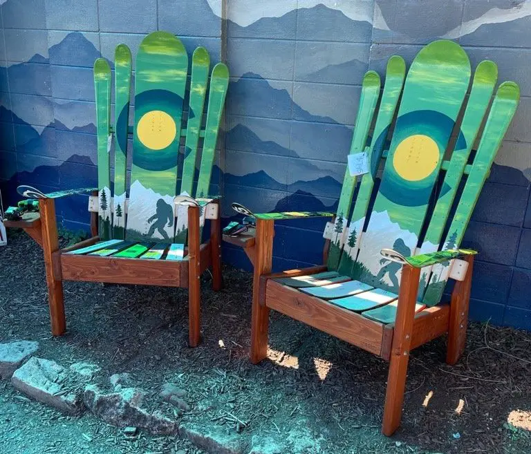 - Constructed in Colorado from retired skis on a sturdy Douglas Fir base. All chairs include a custom ski binding cup holder. Big enough for a stein.