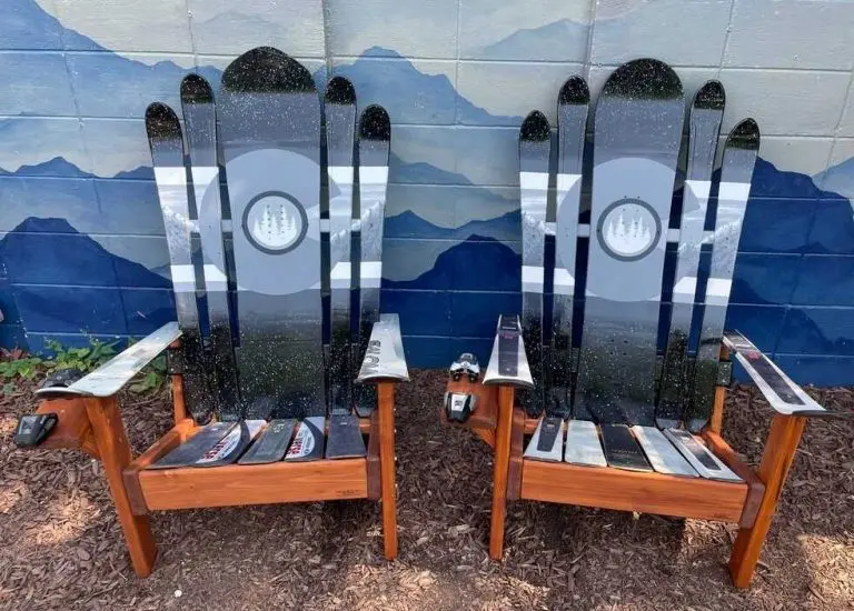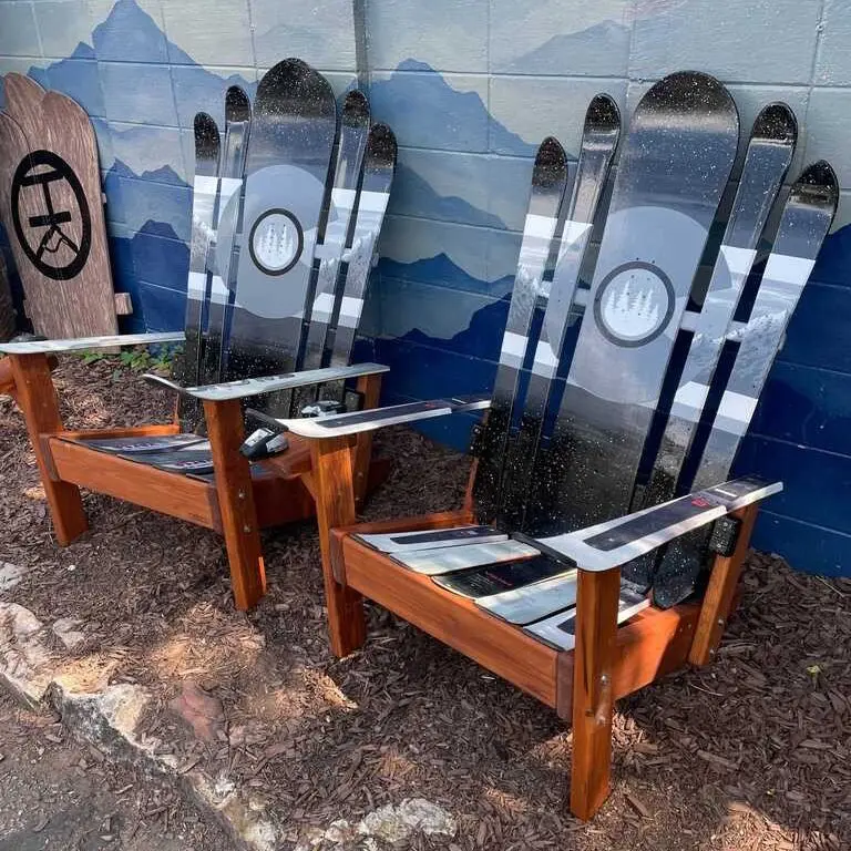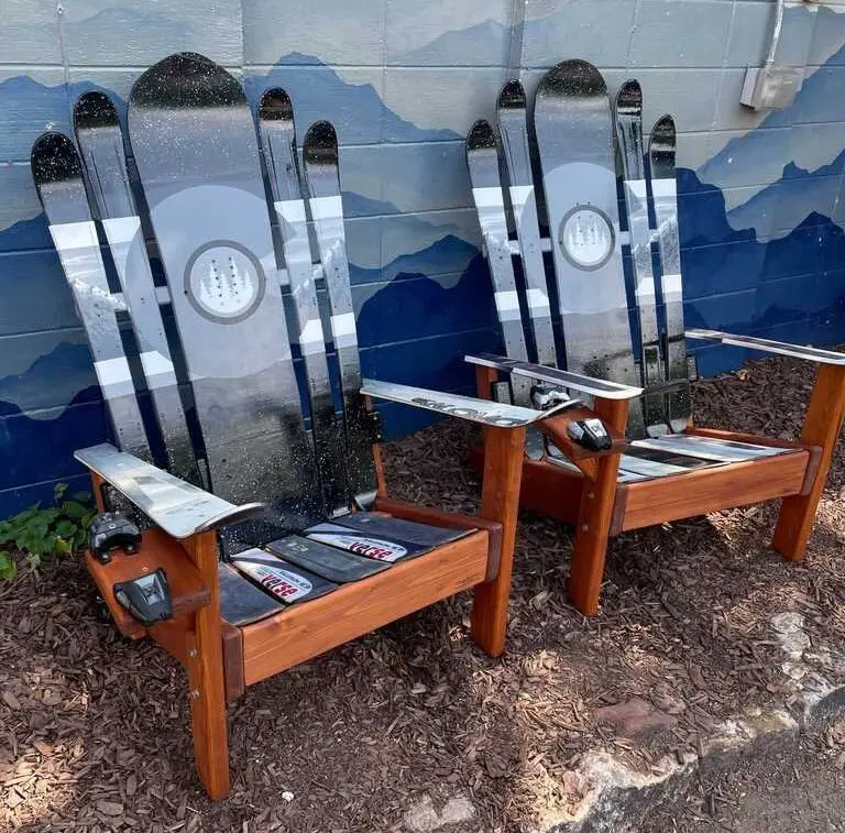 - Constructed in Colorado from retired skis on a sturdy Douglas Fir base. All chairs include a custom ski binding cup holder. Big enough for a stein.