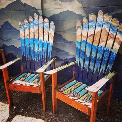 - Constructed in Colorado from retired skis on a sturdy Douglas Fir base. All chairs include a custom ski binding cup holder. Big enough for a stein.