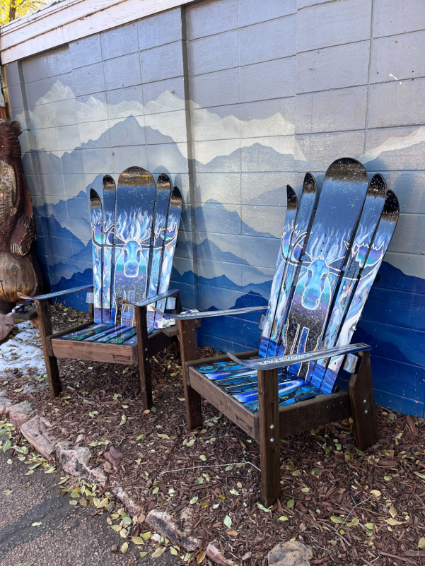 - Constructed in Colorado from retired skis on a sturdy Douglas Fir base. All chairs include a custom ski binding cup holder. Big enough for a stein.