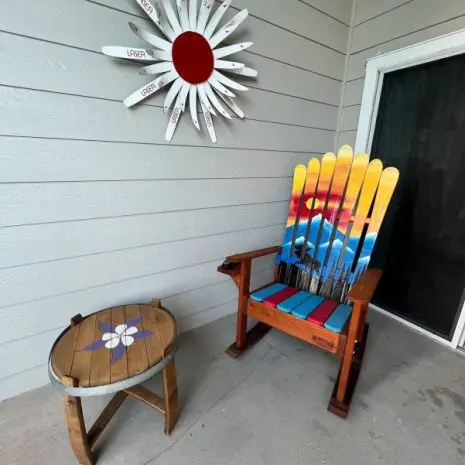 This Set of 3 – Sunset Moose Adirondack Ski Rocking Chair & Ski wall art (request your favorite colors) and barrel side table offer a sporty outdoor vibe, making them a great addition to any venue. With their stylish appearance, Impress friends and family with these beautiful chairs! With extensive customizability, you will have a truly original piece. Built with quality in mind, these chairs offer both comfort and durability.