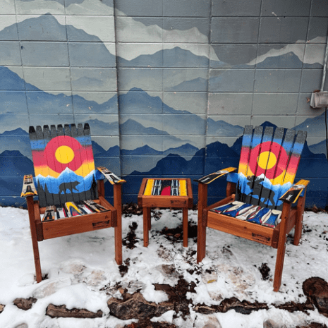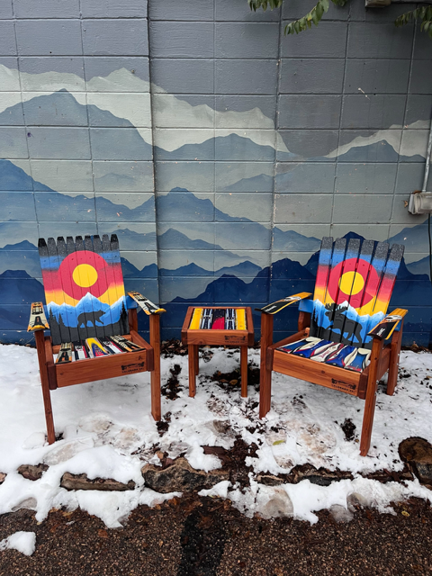 Set of 3- (2) chairs and a matching table. The “Colorado Flag Sunset Mountain & Bear ALPINE” Chair – Our NEW Modern Indoor/Outdoor (More Compact Design) Snowboard & Ski Chair
