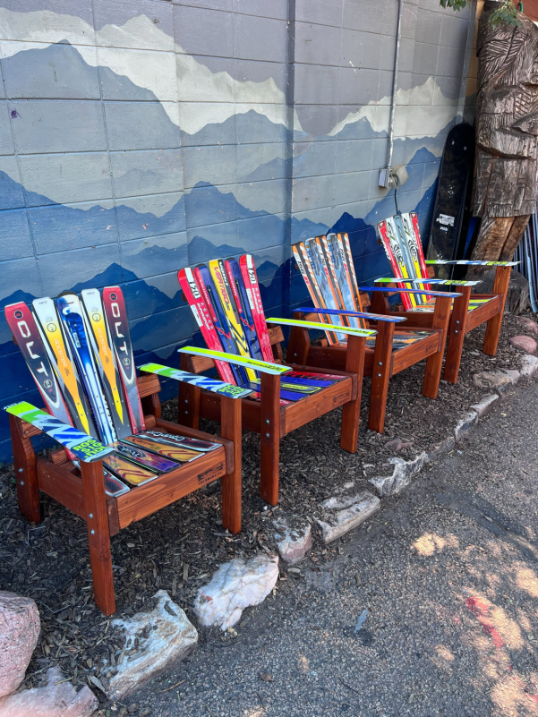 You get to customize this chair by requesting the wood stain & ski colors you want! Constructed from retired skis on a Douglas Fir base, all of our furniture is incredibly durable and made to last wear and tear of indoor or outdoor elements.